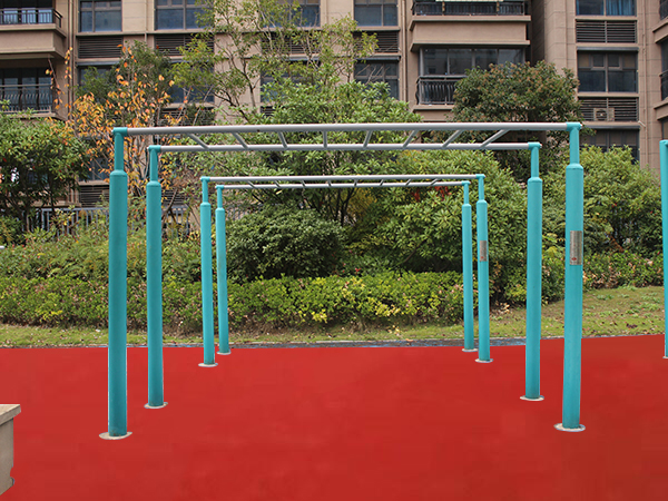 规格:3514×918×2300mm;材质:钢管,φ60×3mm,钢管,φ114×3mm;工艺:焊接采用氩弧焊及CO2气体保护焊(符合GB/T8810-1995要求),整体加工成型后经技术人员进行热镀锌及抛砂处理,表面再喷涂户外聚酯珠光粉末,高温固化,表面光滑,抗紫外光能力强,色彩鲜艳,不易脱落,耐腐蚀;喷涂设备采用静电粉末喷涂装置,粉末回收采用小旋风和滤心;产品性能:1、屈臂悬垂:双手握横杠,向上至肘成角悬垂。2、以手代频:双手握杠交替前行,增强上肢耐力和灵活性。